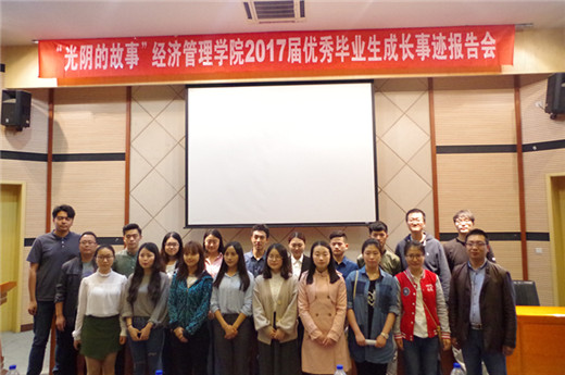 4月25日晚,我院2017届毕业生成长事迹报告会在思学楼a114举行。党委副书记覃吉春、电子商务教研室老师苏昊、经济学教研室老师刘仕华、各年级辅导员、经管院的同学们一起分享了6位毕业生的成长故事。