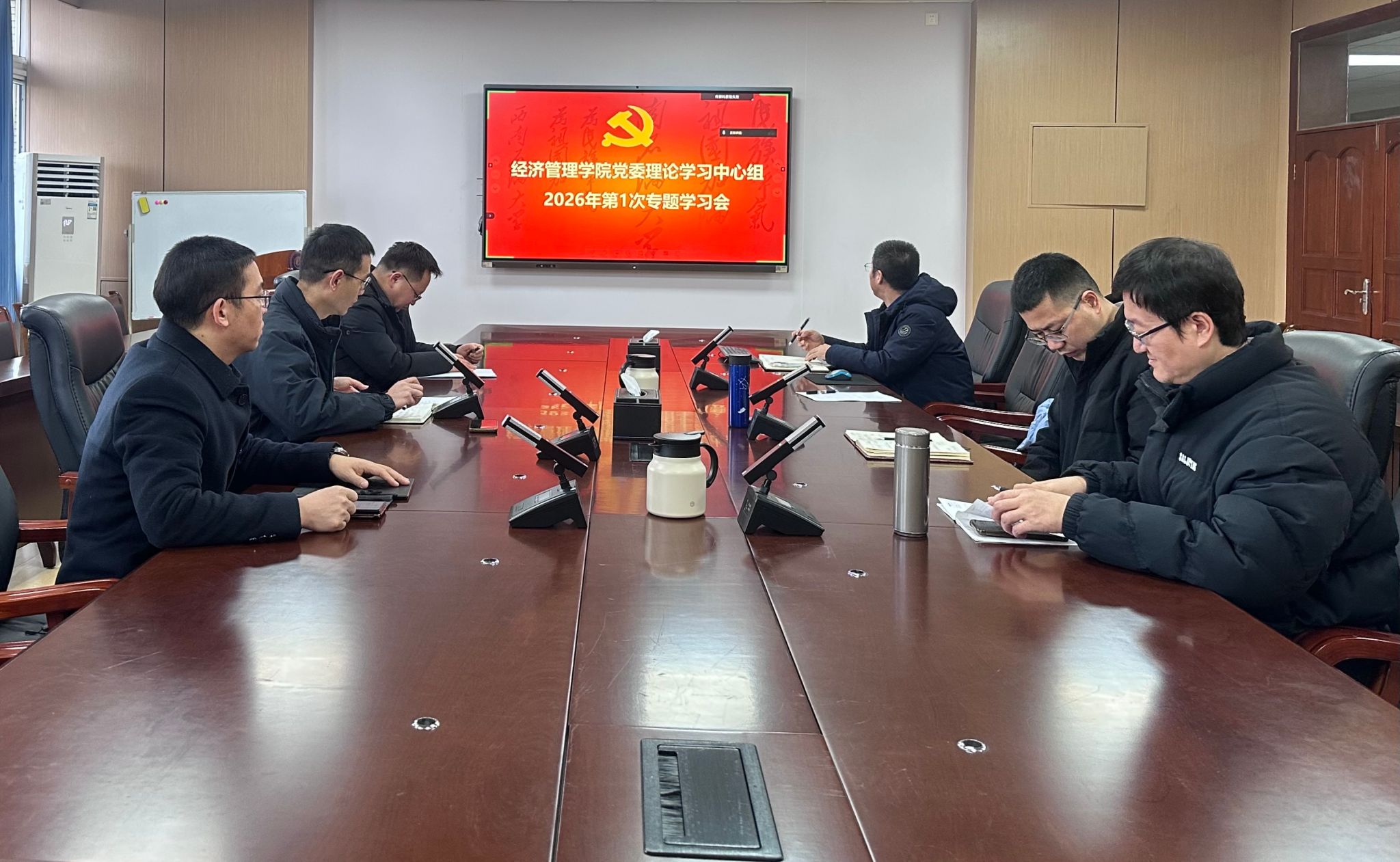 1月15日,经济管理学院党委理论学习中心组举行2026年第1次集体学习,深入学习贯彻习近平总书记在中共中央政治局第二十一次集体学习时的重要讲话精神、关于锲而不舍落实中央八项规定精神的重要指示,并集中观看习近平总书记2026年新年贺词视频。学院党委书记曾有为主持学习,中心组成员参加。