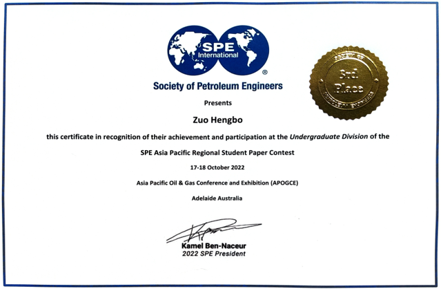 左恒博获得SPE论文竞赛亚太地区本科组第三名