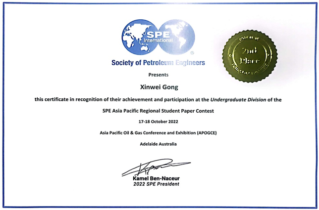 龚新伟获得SPE论文竞赛亚太地区本科组第二名