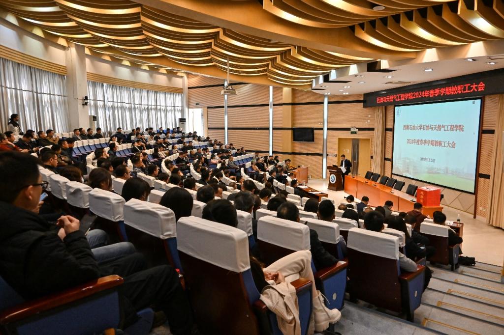 3月21日,石油与天然气工程学院2024年春季学期教职工大会在思学楼A114召开,会议由学院党委副书记、纪委书记钱广主持,学院班子成员、全体教职工共计200余人参会。
