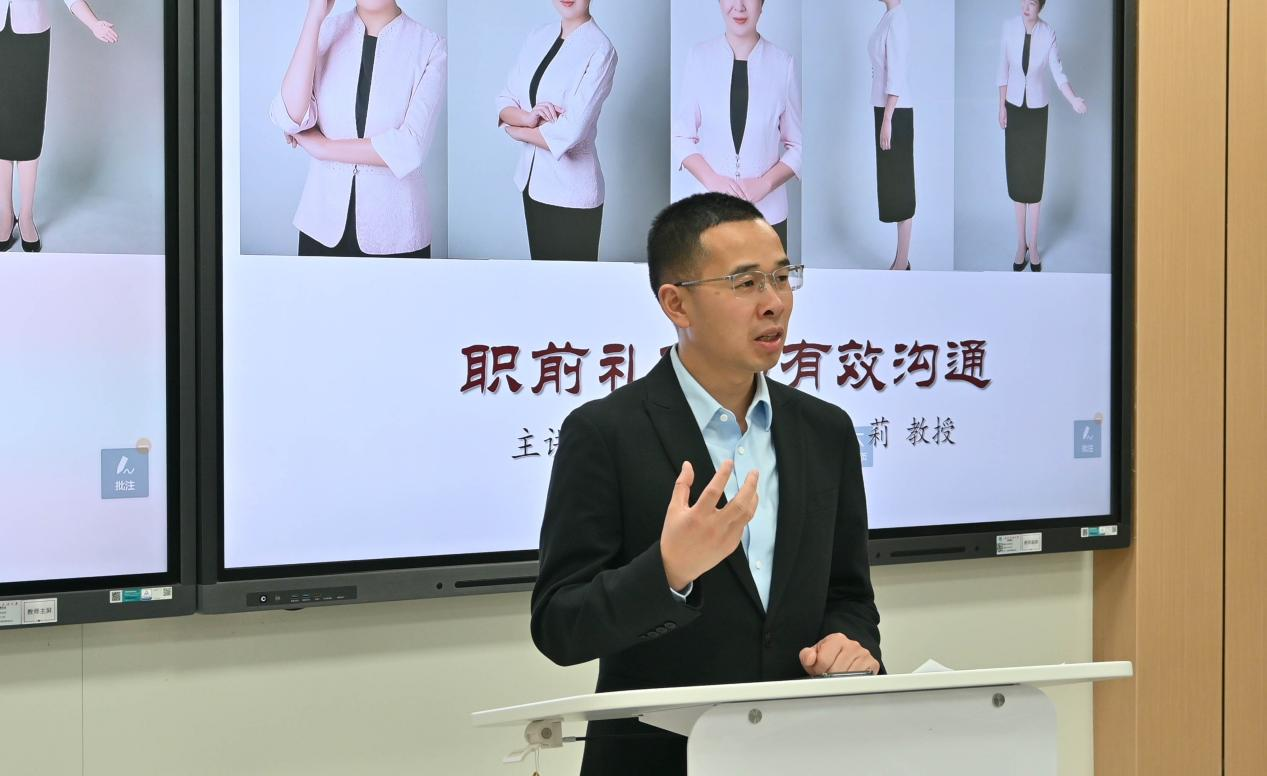 钱广首先为同学们介绍了主讲人林莉,并着重强调职场礼仪和沟通技巧在职业生活中的重要意义。