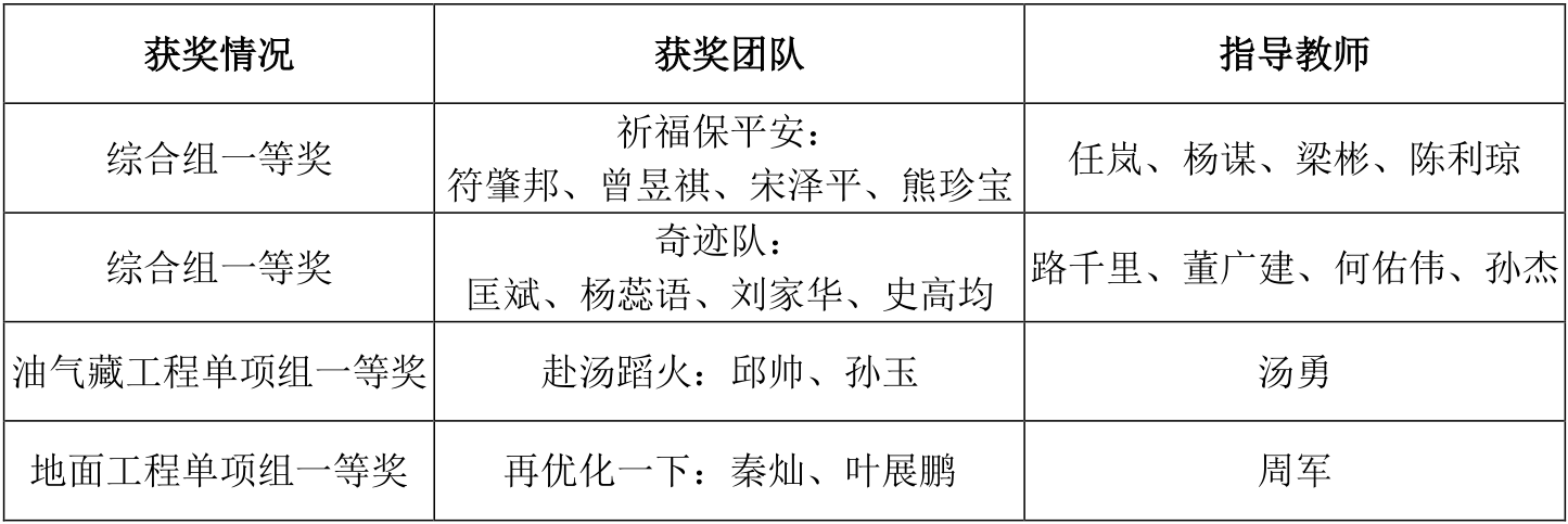 近年来,我校在该赛事上屡获佳绩,展示了我校“双一流”建设的显著成效,提高了学校的行业声誉。我们将继续把高水平学科竞赛作为培养创新性应用型人才的重要平台,以赛促学、以赛促练、学赛结合,构建工程能力培养体系。着力培养有理想、敢担当、能吃苦、肯奋斗的油气新青年,加快推进“双一流”建设,瞄准“碳达峰碳中和”的目标,为国家能源战略安全和地方经济社会发展作出更大贡献。