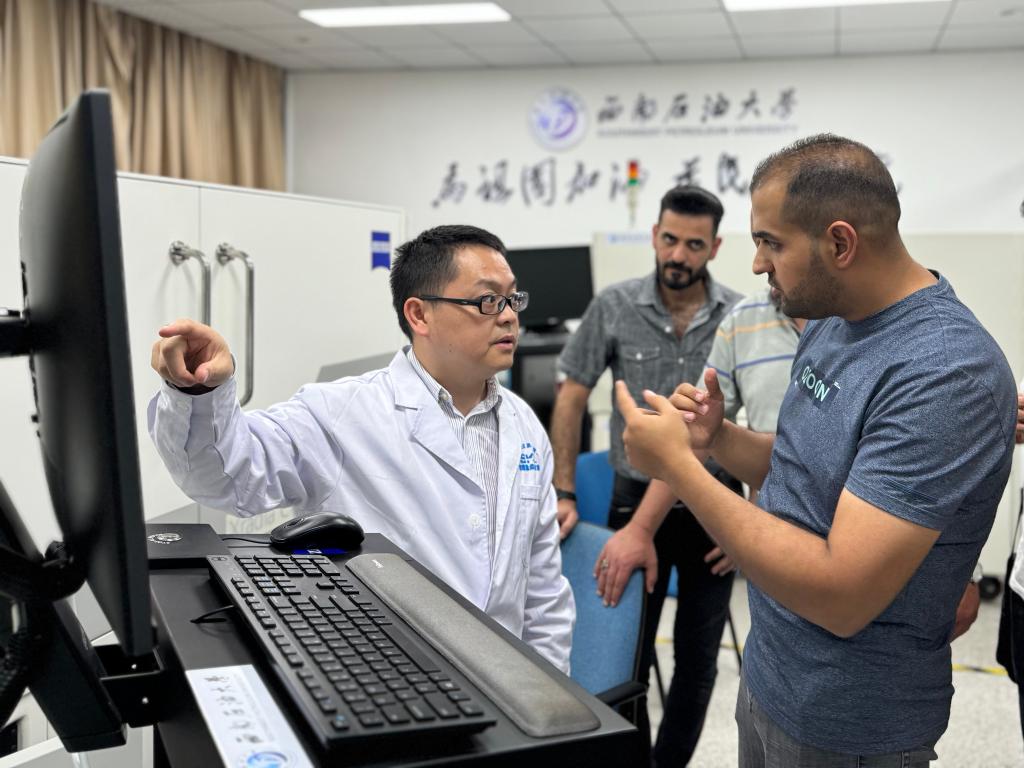 肖文联教授(左)与伊拉克石油部学员进行技术交流