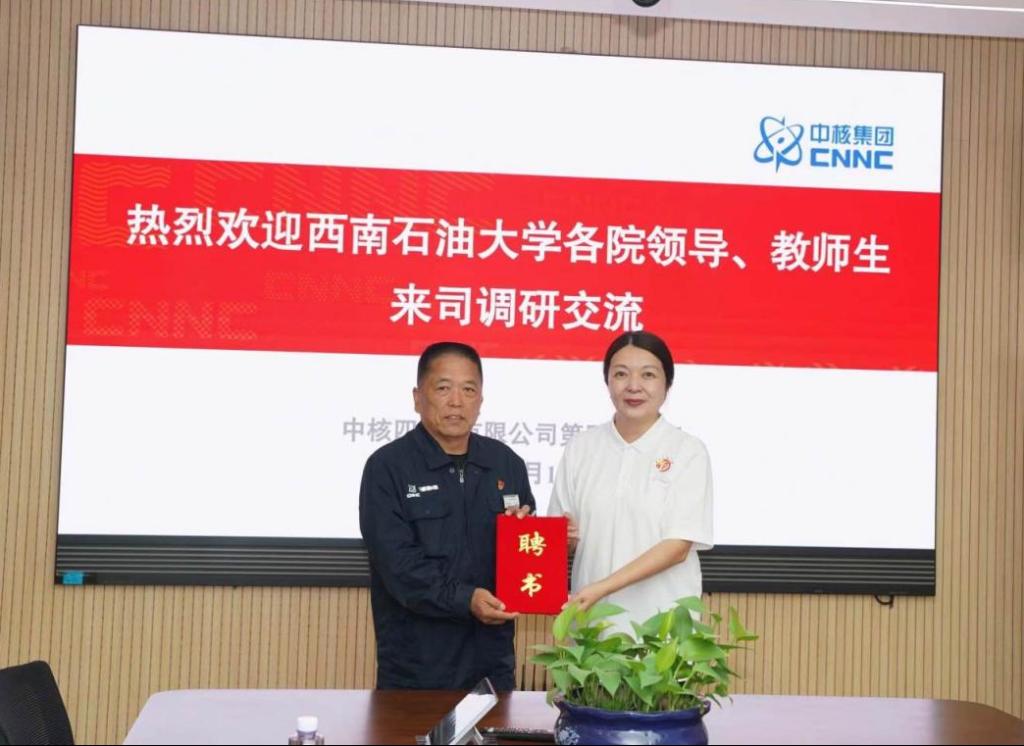 上午10时,钱广、林莉携实践团全体成员与第四分公司主要领导、技能大师及校友开展调研交流会。交流会上,中核四〇四有限公司相关代表首先介绍了公司概况、人力资源情况以及校企合作情况,全面地展示了中核产业在我国核能源领域的重要地位与贡献。随后钱广、林莉与中核公司相关领导进行了深入交谈,钱广希望能够将“四个一切”核工业精神、“同星精神”等革命奋斗精神以及新时代“大国工匠精神”带进校园,让石油学子从这段岁月的艰苦历程中汲取奋进力量。会上,三名校友与实践队老师进行了亲切交流,钱广表示,希望石油学子在中核四〇四能肯吃苦、勇担当、敢作为,秉承“为祖国加油,为民族争气”的大学精神,在岗位上发光发热。会议最后,林莉为中华技能大奖获得者、全国技术能手刘金生大师颁发聘书,聘请担任为西南石油大学“大思政课”师资库特聘教师。