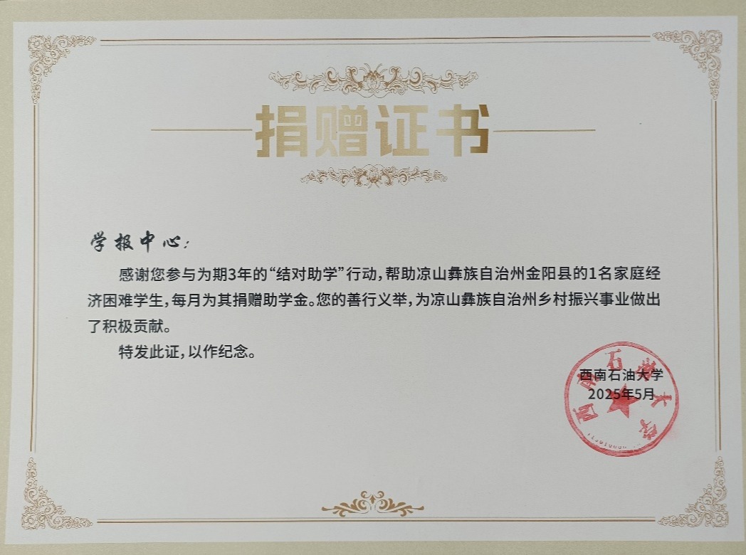 5月20日,西南石油大学油气储运系统节能优化与安全评价团队联合学报中心党支部,共同发起“结对助学”特别行动。该行动通过建立资金保障机制,精准帮扶凉山州金阳县德渣村一名困境学生,以实际行动响应学校关于巩固拓展脱贫攻坚成果同乡村振兴有效衔接的号召。