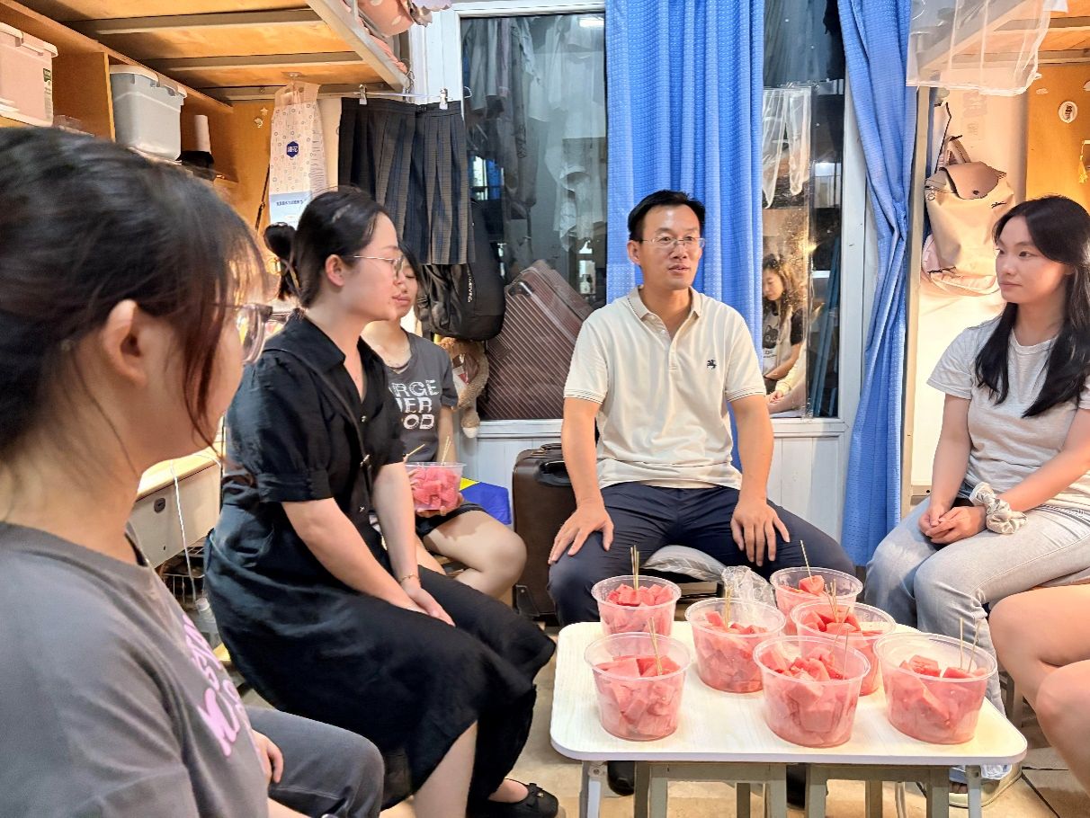 宿舍区内,灯光融融,洋溢着温馨与惜别之情。学院领导与毕业生们亲切交谈,关切询问:“求职进展顺利吗?”“工作岗位确定了吗?”“深造院校和导师联系好了吗?”“离校手续还有需要我们协调解决的吗?”句句问候温暖人心。