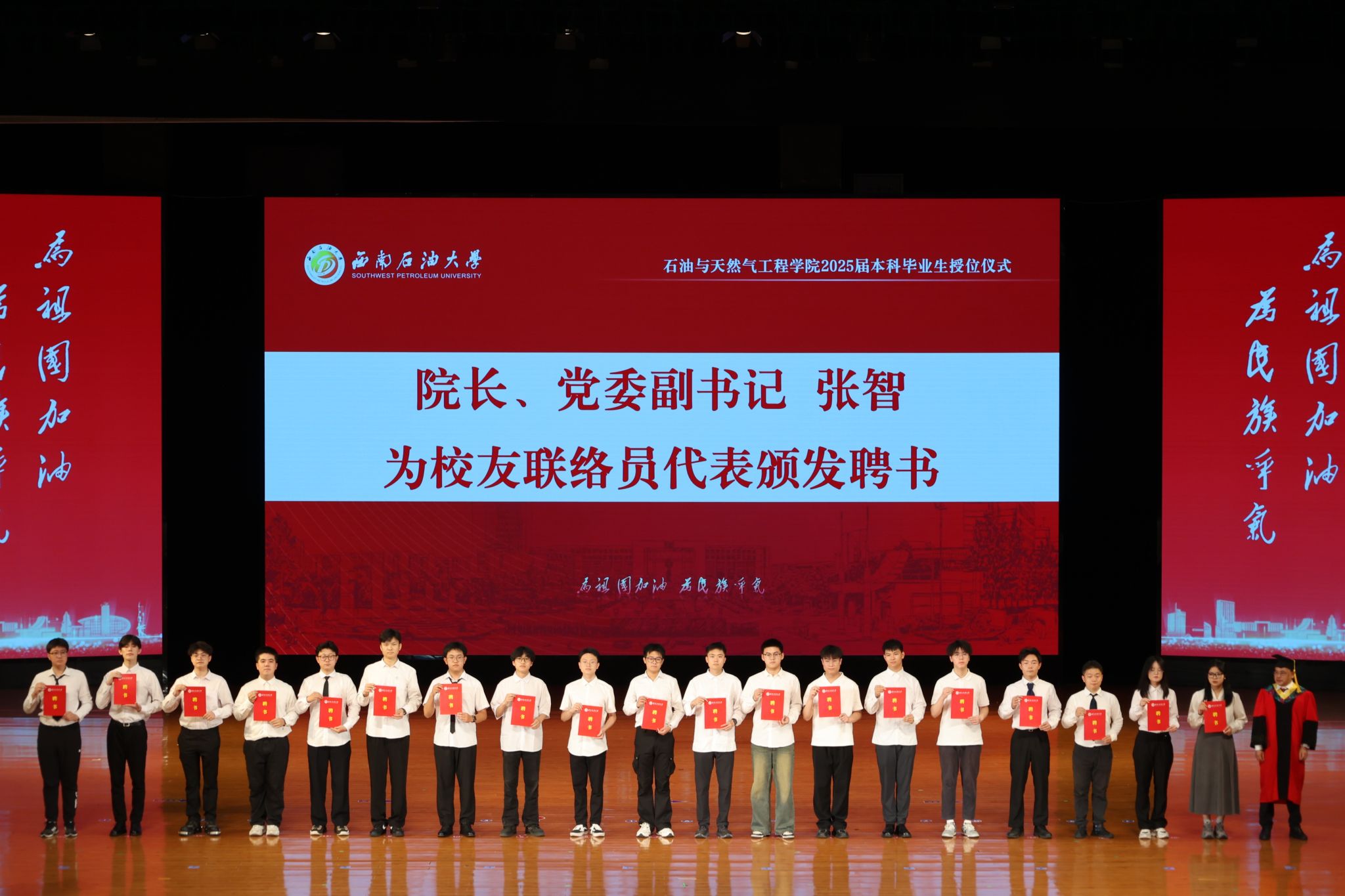 院长张智发表致辞,他向顺利完成学业的毕业生表示热烈祝贺,并回顾了同学们在校期间的努力与成长。张智勉励毕业生们继续发扬“为祖国加油,为民族争气”的石大精神,在未来的人生道路上始终保持学习的热情,勇于担当社会责任,为国家的能源事业贡献力量。他特别强调,无论走到哪里,母校永远是学子们坚强的后盾。随后,张智为校友联络员颁发了聘书。校友联络员将作为学院与毕业生之间的纽带,助力校友与母校的紧密联系,促进共同发展。