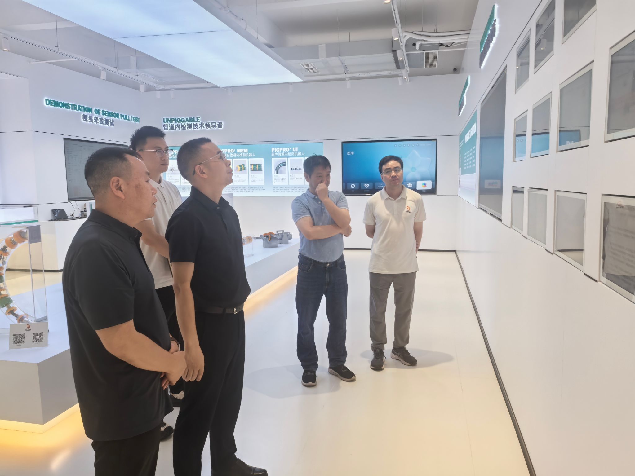 钱广一行在四川德源负责人卢宏海、张勇的陪同下,参观了企业的智能化生产车间,技术人员详细介绍了管道检测设备研发、智能监测系统应用及安全生产技术创新成果,展示了企业在能源管道领域的技术实力与行业影响力。钱广对企业在数字化转型和安全生产方面的探索给予高度评价,并表示学院专业设置与企业技术需求高度契合,双方合作空间广阔。