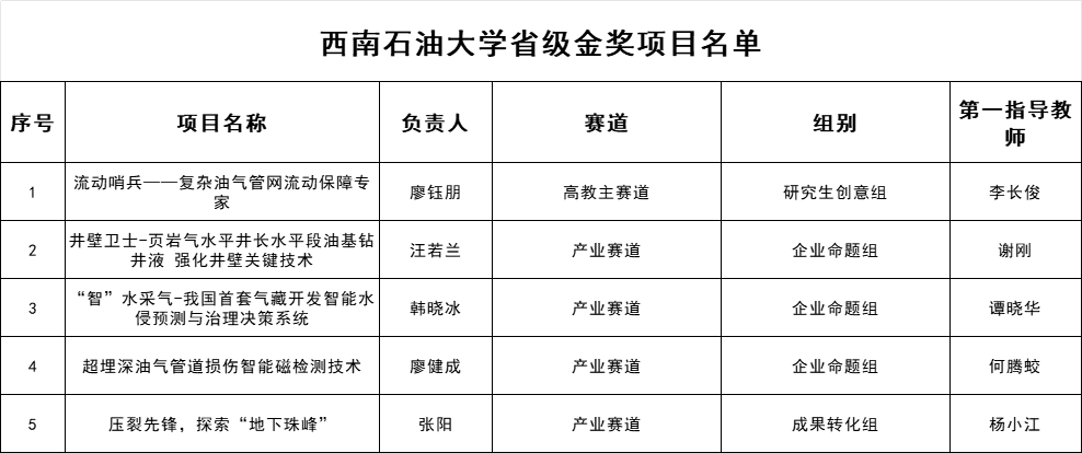 获奖项目亮点纷呈,聚焦前沿服务发展。本次我院获得金奖的项目:1、流动哨兵-复杂油气管网流动保障专家:研发油气管网智能调控技术,提升输送效率与安全性;2、“智”水采气-我国首套气藏开发智能水侵预测与治理决策系统:开发国内首套水侵预测治理决策系统,助力气田精准治水与增效;3、井壁卫士-页岩气水平井长水平段油基钻井液强化井壁关键技术:创新油基钻井液技术,攻克页岩气水平井井壁失稳难题;4、超埋深油气管道损伤智能磁检测技术:突破超深管道损伤检测技术,保障长输管道安全;5、压裂先锋,探索“地下珠峰”:首创超深层储层压裂工艺,解锁“地下珠峰”油气资源。这些项目紧密对接国家和区域能源发展战略需求,展现了我院学子在油气勘探开发、管网安全、智能决策等领域的创新实力。