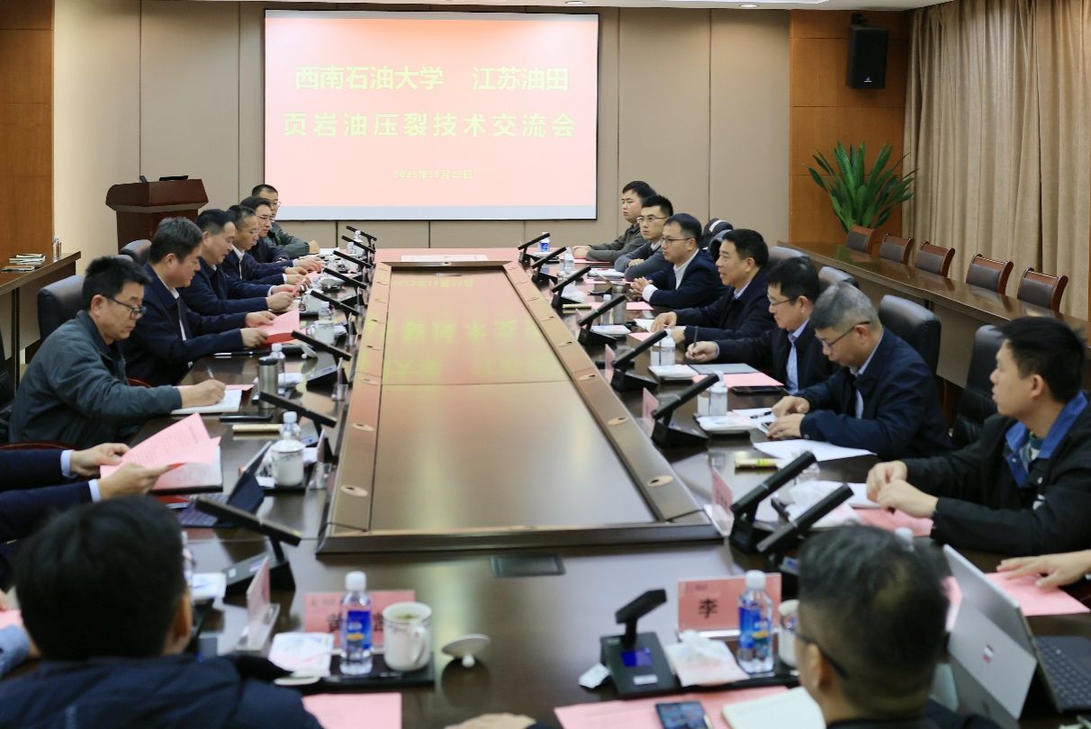 11月25日,校党委副书记、校长、非常规油气开采教师团队负责人郭建春率队赴中国石化江苏油田分公司开展技术交流,聚焦苏北页岩油开发中的“控规模”与“保产量”的核心难题,推动产学研精准对接。交流会由江苏油田分公司副总经理周宇成主持。