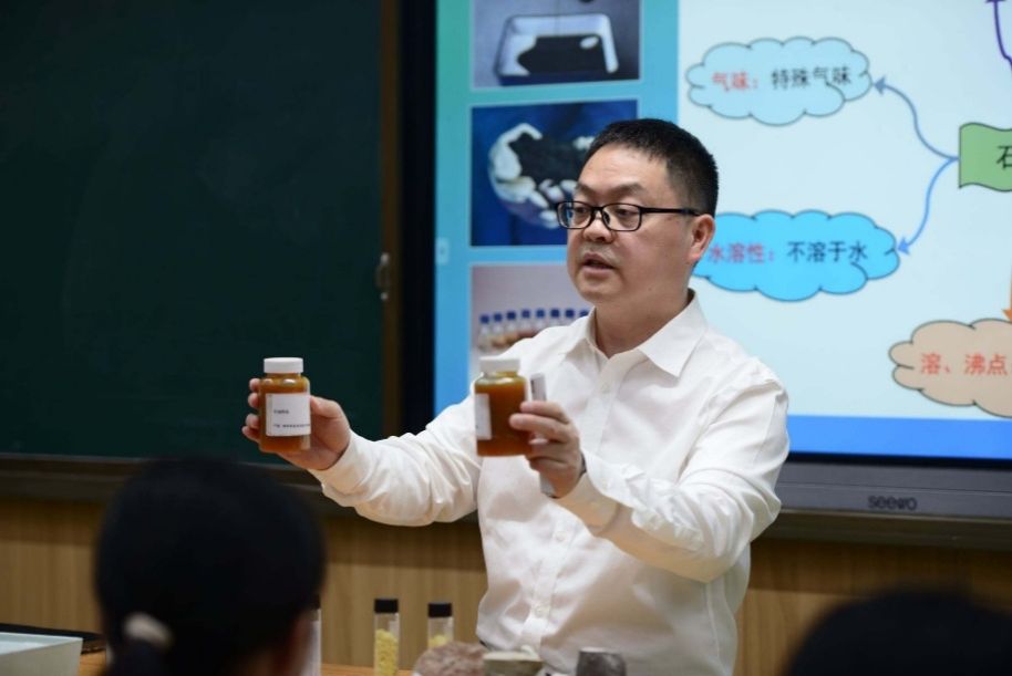 肖文联以“让我们一起来聊石油”为题,从“我与石油之缘分”切入,围绕石油的用途、形态、成因、开采等展开讲解。报告设置实物演示环节,通过展示岩石与石油样本,引导学生观察石油的特殊气味、不溶于水、密度比水小等核心物理性质,并结合样品差异解析不同地质条件下石油组分的变化规律,让抽象知识变得可感可知。