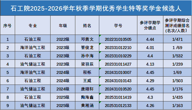 优秀学生奖学金候选人名单