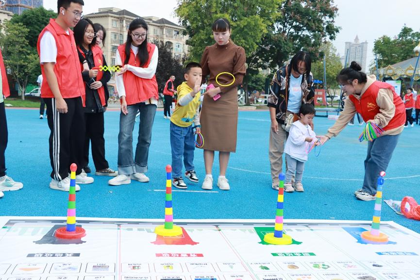 此次活动共分为三个板块进行。其一,志愿者们和社区工作者进行具体的活动概况交流后,便开始搬运物资、布置场地,组织社区的居民家长和孩童来到活动地点,以游戏的形式向孩子们科普垃圾分类重要性。其二,志愿者们通过趣味小游戏吸引孩子们的注意力并提高对实践垃圾分类的兴趣。例如,投掷骰子“飞行”到不同区域,完成相应“垃圾分类”小任务的“垃圾分类问答飞行棋”;在志愿者指定垃圾类型后,两侧小朋友用沙包砸向对应中间装扮着四个垃圾分类箱标识的小朋友的“扔沙包”小游戏;还有“垃圾分类知识问答” “垃圾分类套圈”等新颖有趣的小游戏。活动期间,孩子们展现了对“垃圾分类”的旺盛热情与好学心态,积极响应,做出正确的答案选择,并得到了精美丰富的奖品志愿者们面对孩子热情亲切,十分有耐心,整个活动有条不紊地进行着,现场气氛欢乐融洽。其三,活动接近尾声,志愿者们对社区工作者和居民家长、孩子进行短暂的采访,大家对此次志愿服务活动都表示高度的赞扬与支持。在活动主要负责人的总结和致谢下,此次活动圆满结束。