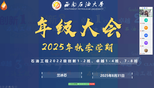 8月31日,石油工程2022级创新1-2、卓越1-4、7-8班以线上形式召开2025年秋季学期年级大会。会议由辅导员兰冰芯主持,围绕“明确毕业季核心任务,助力学子顺利成长”主题,为毕业生规划大四学年学习、就业与考研路径。