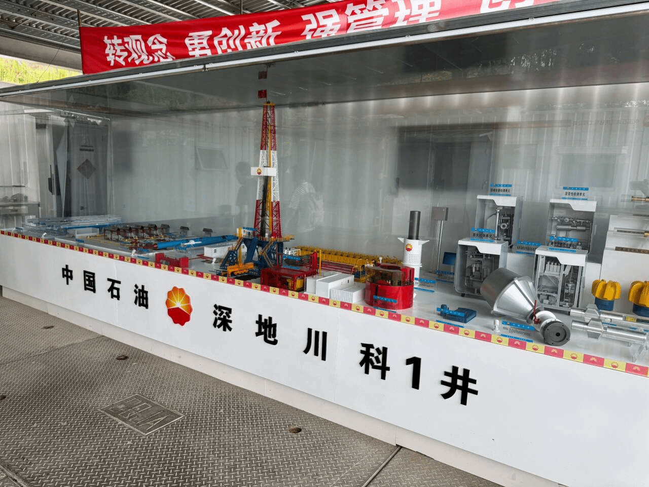 从公司展厅来到深地川科1井现场,实践队首先在仿真模型展厅驻足研讨。队员们在印有“中国石油 深地川科1井”的模型前举起队旗,背景中“转观念 勇创新 强管理 创一流”的横幅格外醒目;“深地川科1井”沙盘完整还原了钻井平台布局、钻机设备与井下管柱结构,循着“钻具组合”“泥浆循环路径”的互动讲解,大家一步步厘清超深井钻井的核心流程,凑近观察深地川科1井仿真模型细节,钻塔、设备的精巧还原让理论知识变得具象可感。随后,在川科1井智能监控室,多屏显示系统实时呈现井场三维坐标、地层压力曲线与井下工况数据,工程师现场演示“压力系统动态预测”“钻头寿命评估”等功能。