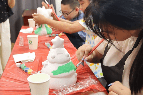 志愿者们穿梭在孩子中间,时而帮低年级小朋友拧开颜料盖,时而轻声鼓励:“不用怕涂错,每一笔颜色都是你心里的故事呀!”渐渐地,原本素净的石膏娃娃一个个“活”了过来:金甲闪闪的小哪吒、彩虹尾的美人鱼、骑独角兽的小精灵……“你们看!这是我画的守护英雄!”小朋友小琪高高举起自己的作品,脸上满是自豪,周围的小伙伴们也纷纷凑过来分享自己的 “创意”,活动室里满是笑声与童趣。