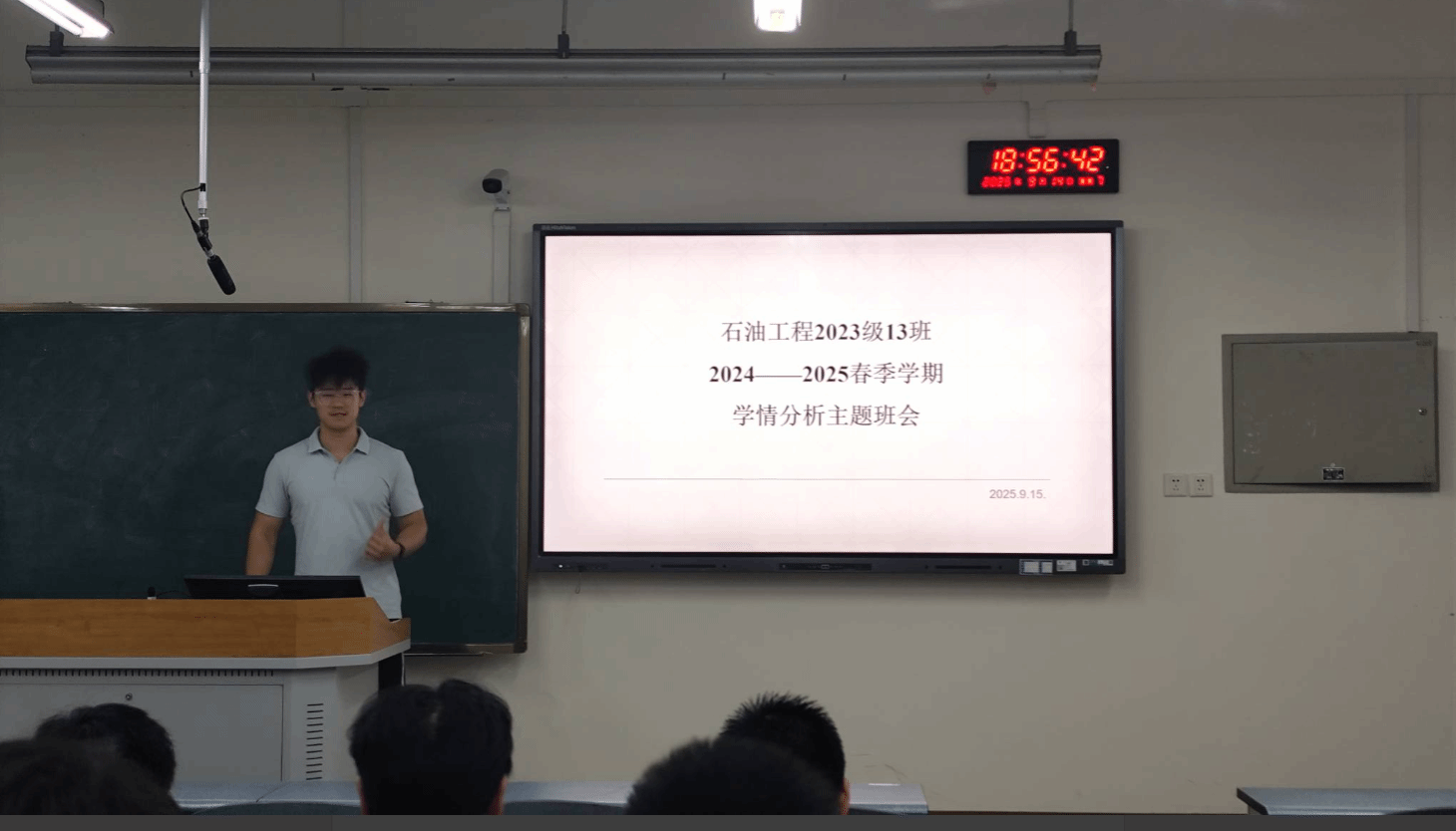班会中段,班长任智航对班级学风给予肯定:“班级整体学业处于中等偏上水平,四级全过值得肯定。”同时针对问题提出强调,需尽快组建“1+1”学业帮扶小组,每周公示出勤数据,对于六级备考,要严格落实统一模拟考。此外,他建议同学们主动关注学院推荐的优质企事业单位信息,将个人成长与石油行业发展需求结合,摒弃“躺平”思想,重视课堂专注度与课后学习效率。