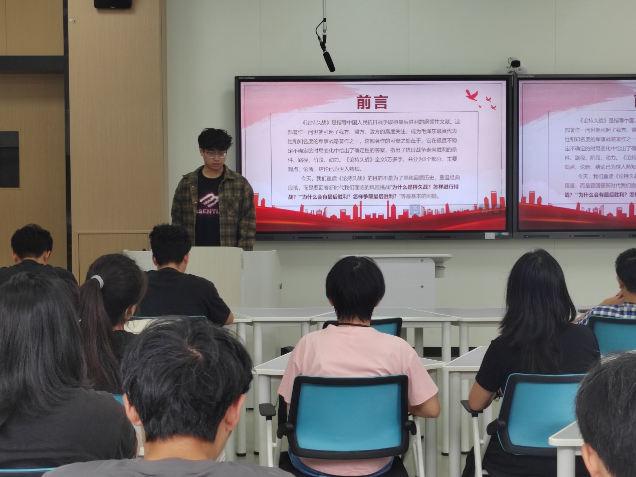 支部党员邢智杰以“感悟《论持久战》思想伟力”为题,从1938年延安窑洞的创作背景切入,回溯抗日战争初期的严峻局势。他系统解读著作核心:通过“敌强我弱、敌退步我进步”等四大矛盾特点,“战略防御、相持、反攻”三阶段规律,以及“兵民是胜利之本”的人民战争思想,结合平型关大捷、台儿庄大捷等案例,让抽象理论具象化。互动中,24级新生李同学结合专业感悟:“海洋油气工程需攻克海上钻井等难题,《论持久战》‘久久为功’的信念,正是应对专业挑战的精神密码”,让红色理论与专业成长深度联结。