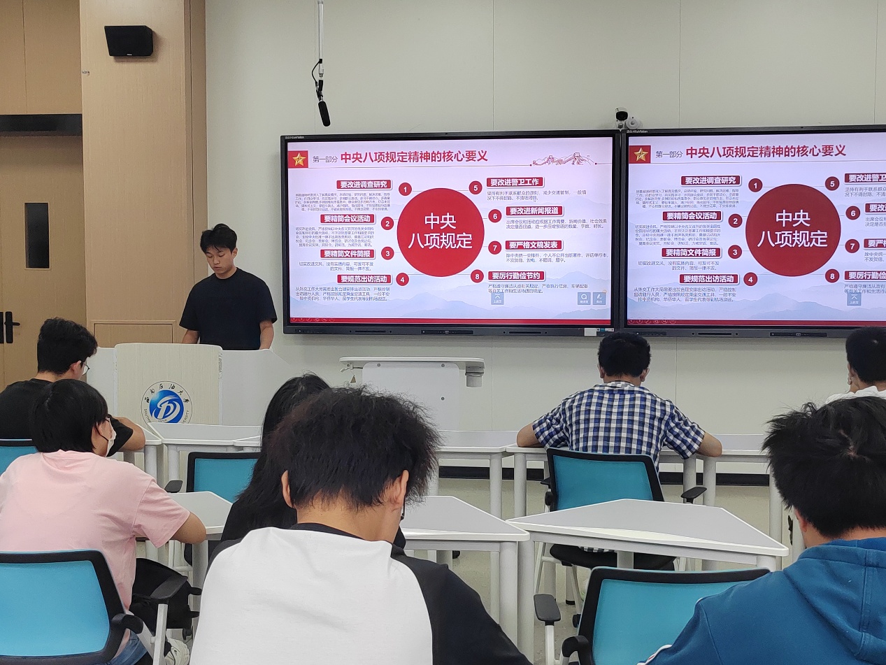 支部党员李炫毅以“加强党的作风建设”为主题,围绕中央八项规定精神展开讲解。他通过拆解“改进调查研究”“厉行勤俭节约”“规范出访活动”等核心要义,并结合“违规吃喝专项整治”“形式主义官僚主义整治”案例及“2024年全国查处违反中央八项规定精神问题22.5万起”的数据,直观展现作风建设成效。针对“青年如何践行优良作风”,新生张棋竣同学分享:“食堂光盘、认真完成作业,就是对‘厉行节约’‘反对形式主义’的具体践行”,让纪律意识落到日常实处。
