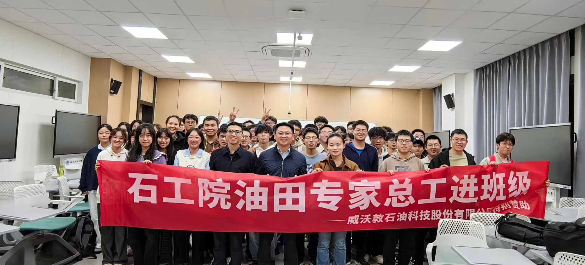 10月28日晚,2025级石油工程专业10班在明辨楼C106举办“油田专家总工进班级”活动。中国石化西南石油工程公司陶祖文专家受邀主讲,班主任邓宽海主持,辅导员上官自然出席。邓宽海为陶祖文颁发学校生涯教育与就业指导导师聘书。