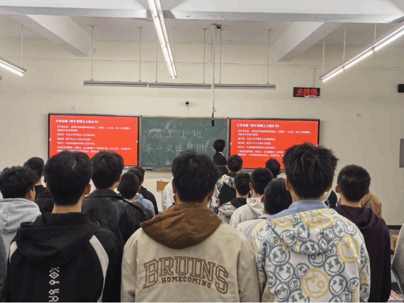 一场以“青年的责任与担当”为主题的班会,将目光聚焦于石油学子的光荣使命。讨论声中,思想的火花被点燃,大家共同擘画着投身能源事业的宏伟蓝图。 当“铁人”王进喜的名字响彻会场,一种跨越时空的精神力量瞬间凝聚。他的先进事迹,如同一座灯塔,将同学们心中炽热的爱国情怀,引航至“能源报国”的坚实航道。