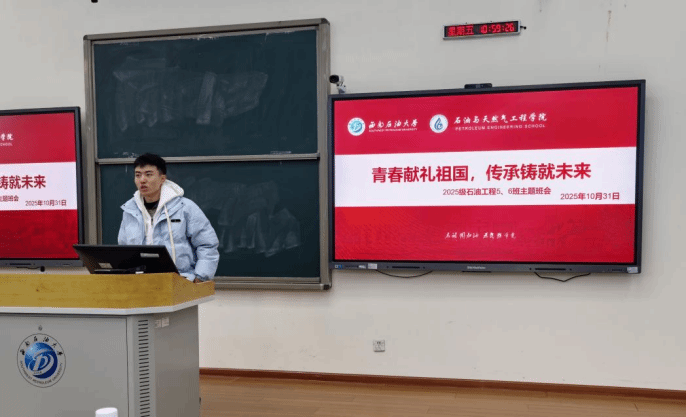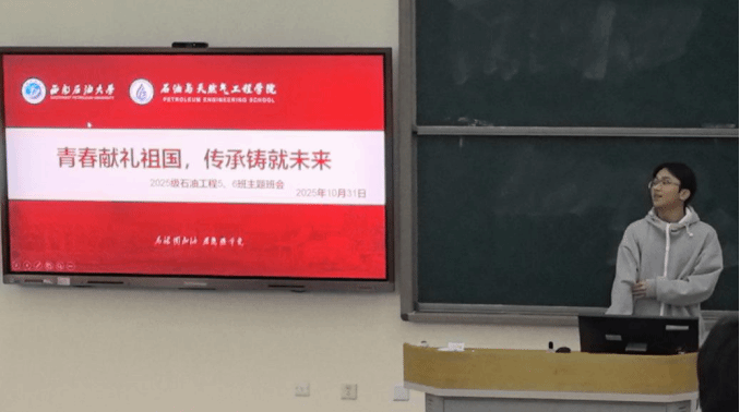 为深化爱国主义教育,引导青年学子将个人理想融入国家发展伟业,近日,我校2025级石油工程5班和6班一起成功举办了一场以“青春献礼祖国,传承铸就未来”为主题的特色班会。班会内容充实,形式多样,现场气氛庄重而热烈。