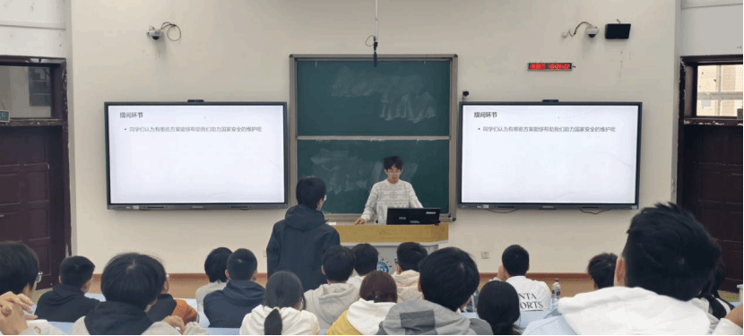 为进一步巩固学习成果,激发参与热情,团课特别设置了“国家安全知识竞赛”环节。此环节由五班团支书主持,竞赛题目紧扣讲解内容,形式活泼,同学们踊跃抢答,现场气氛紧张热烈。在寓教于乐的竞答中,国家安全知识得到了有效普及和深化。
