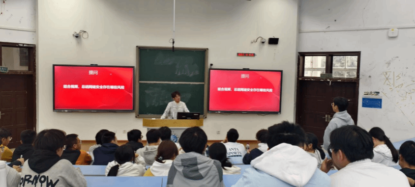 随后,6班团支书杨竣杰同学深入剖析了“国家安全对生活的影响”,通过观看视频并提问的方法,让同学们深刻了解到国家安全中的网络安全也是十分重要的 。 网络安全提问环节