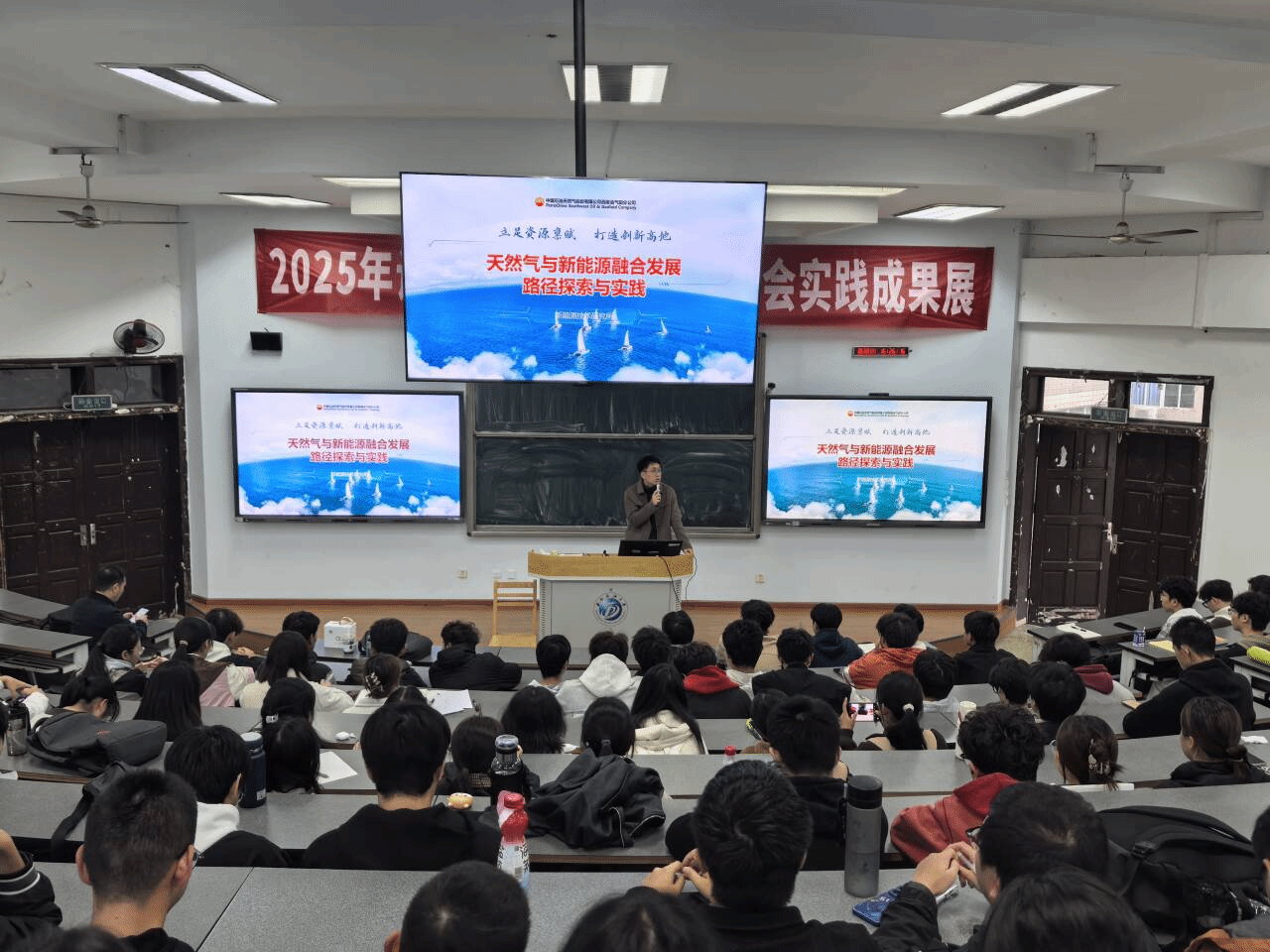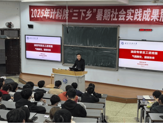 为助力油气储运工程专业学子洞悉油气与新能源发展前沿动态,推进我院本科生职业生涯规划和就业指导工作,2025年11月6日,油气储运工程2025级2、3、4班,2024级1、2、4、5班师生共200余人在思学楼C210联合开展“石油总工进班级”活动。中国石油西南油气田分公司天然气研究院班久庆博士为我院学子作了题为“天然气与新能源融合发展路径探索与实践”的精彩报告。