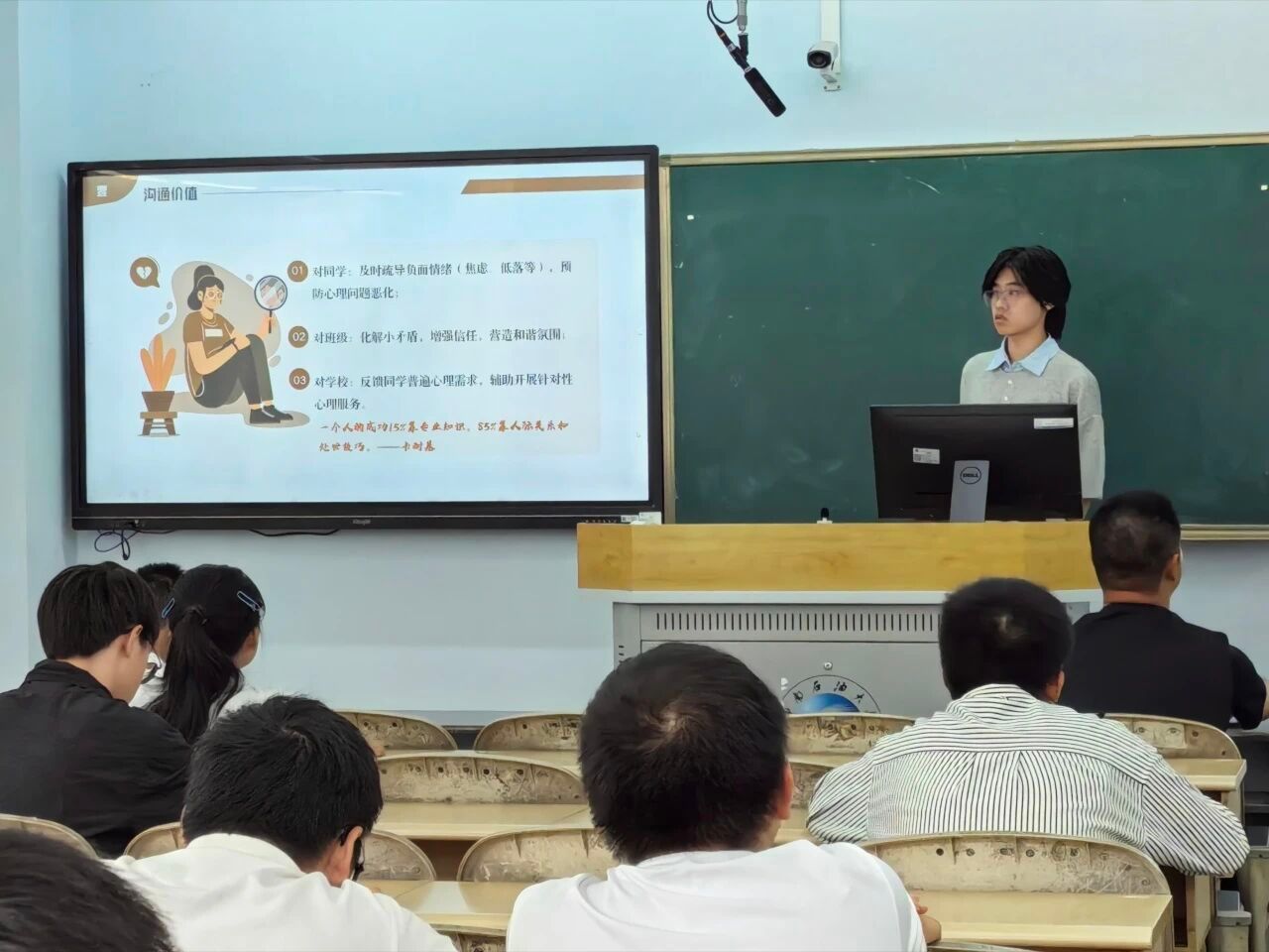 活动部陈勋昊部长以趣味 PPT 讲解 “如何营造班级良好氛围”,明确心理委员 “老师小雷达、同学树洞、班级小太阳” 的定位,提出三大实操建议: