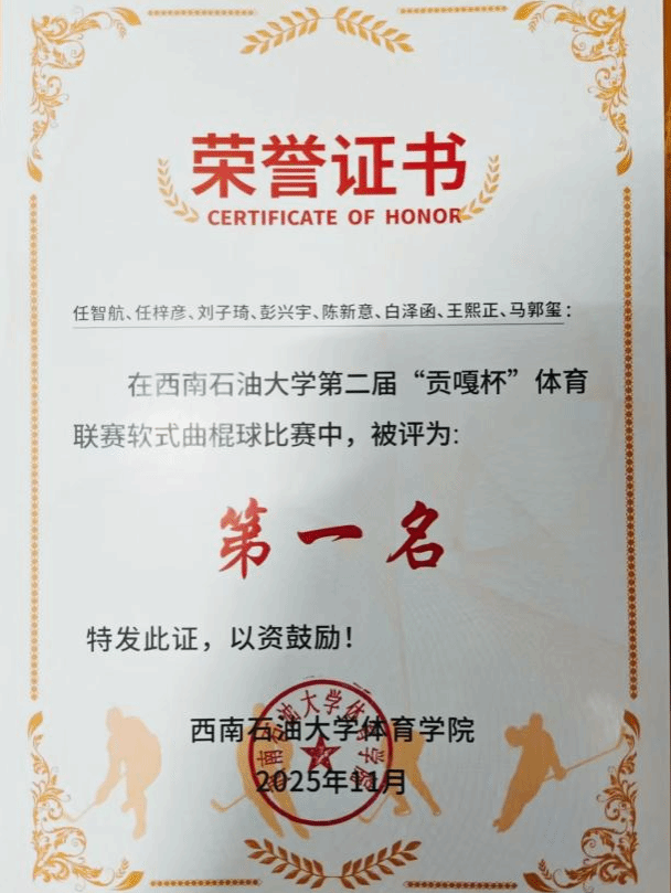 赛后,西南石油大学体育学院为获奖队伍颁发荣誉证书。这场冠军征程,不仅是“加油争气队”的荣耀时刻,更是石工院学长团结与实力的完美展现,成为石工院学子在体育领域“服务与竞技并重,成长与担当同行”的生动写照。