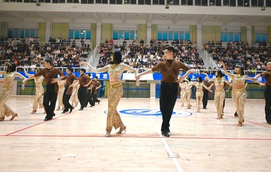 《鎏金沙影》从古埃及文明重汲取灵感,将埃及传统舞蹈的灵动与拉丁舞的热烈风情融为一体。舞者们身姿摇曳、步伐轻盈,仿佛将观众带往遥远而神秘的尼罗河畔。金色光影交错间,风沙与热浪藏于跃动的步伐,千年历史的回响融于起伏的旋律。演出不仅展现了浓郁的异域文化韵味,更通过现代表演语汇,完成了一场跨越时空的艺术对话。获得评委的一致好评和现场观众的热烈掌声,成为本届体育节文艺汇演中一道亮丽风景。
