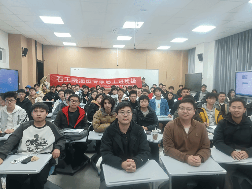 2025年11月23日晚7时,石工2025级1班与8班于明辨楼C106教室联合举办了“油田专家总工进班级”主题分享会。本次活动特邀我校杰出校友、现任油田专家总工第凯翔学长重返母校,就行业前景、职场感悟及成长建议等话题与同学们展开深入交流。班主任寇祖豪老师与辅导员上官自然老师作为嘉宾出席,全体同学共同聆听了本次分享。活动伊始,第凯翔学长步入那间熟悉的教室,不禁感慨万千。他忆起十年前求学时的铁木桌椅,再对比今日的智能教学设施,不禁为母校办学条件的飞速发展感到由衷的欣喜与自豪。