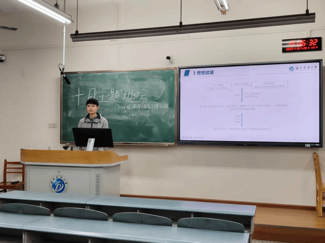 2025年11月23日晚,西南石油大学海洋油气工程专业二班“学长经验分享会”在博学楼B306顺利举办。本次分享会邀请本专业高年级优秀学长张晶棠,围绕大学学习、竞赛、选课、就业等核心话题,结合自身经历分享实用经验,为2024级海洋油气工程二班同学答疑解惑。会议由班长主持,现场氛围热烈,互动频繁。辅导员张陈月老师参加班会。