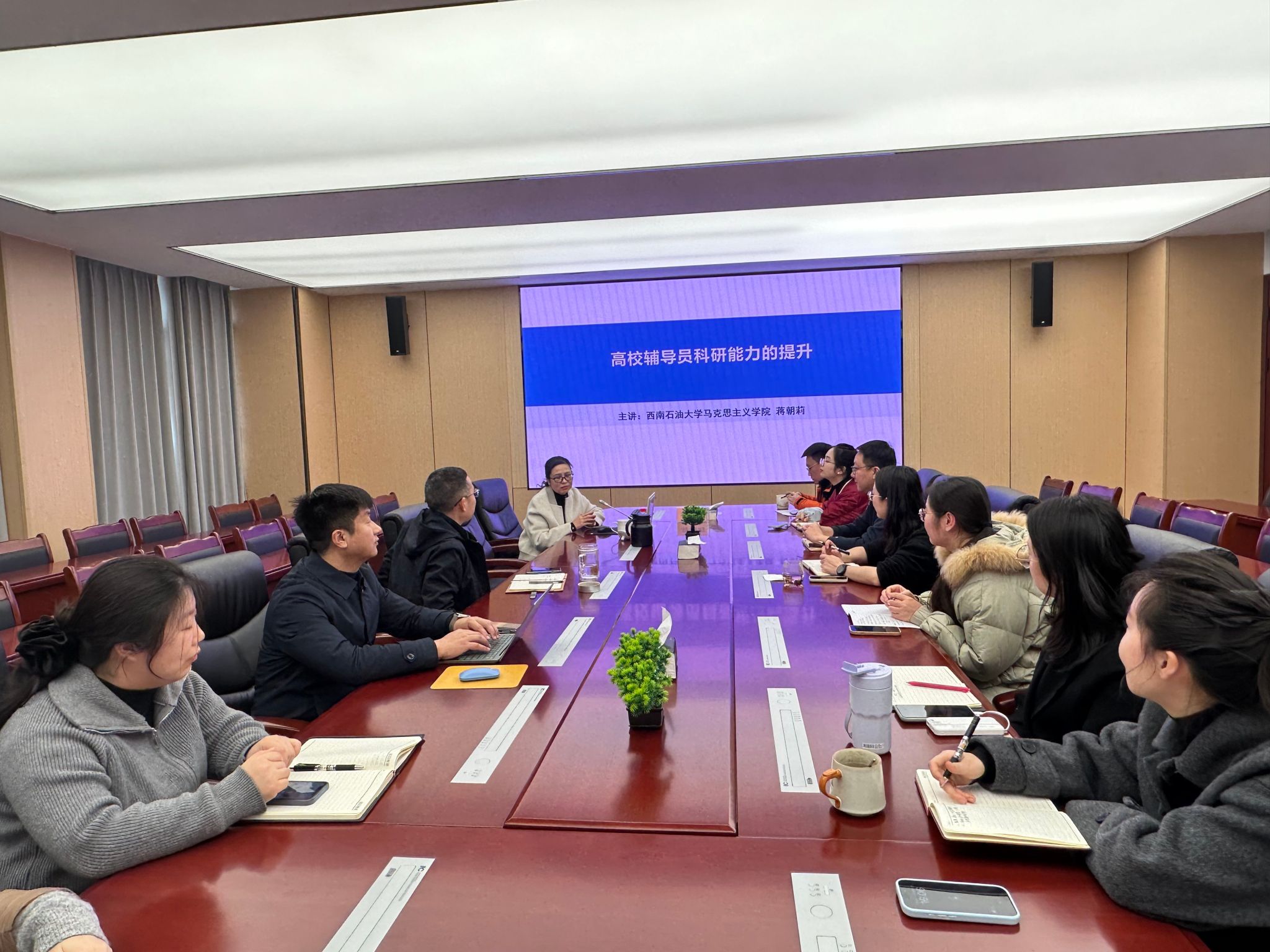 为深入贯彻落实《教育强国建设规划纲要(2024—2035年)》精神,进一步加强辅导员队伍建设,提升辅导员科研素养与思政工作研究能力,2026年1月12日,石工院特邀马克思主义学院蒋朝莉教授开展题为“辅导员科研能力的提升”专题培训,学院党委副书记钱广,全体辅导员参加了本次培训。