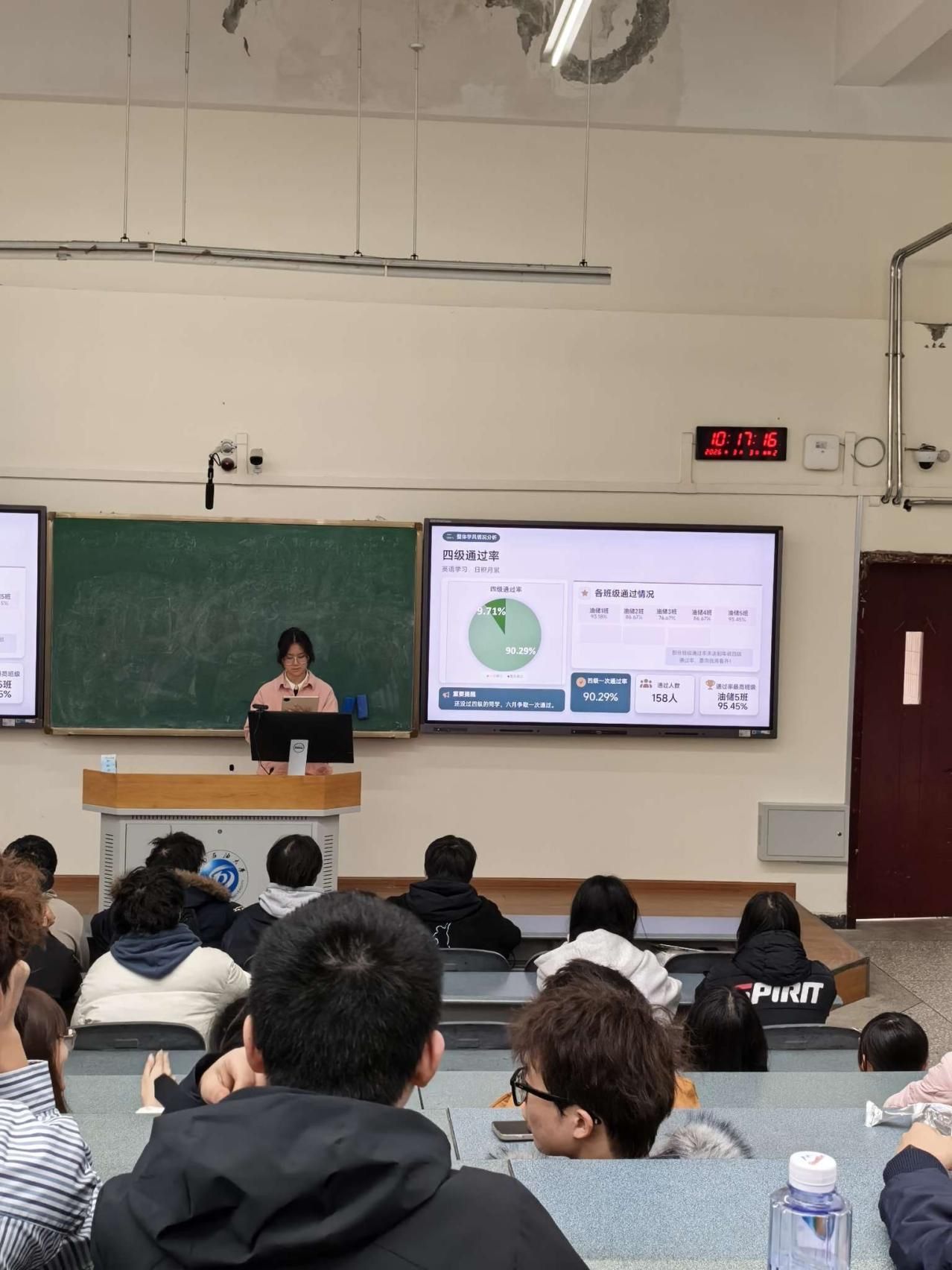 年级班长罗陈兴作上学期学情分析报告,全面复盘年级学业情况:年级整体学风良好,但班级间发展不均衡,储运 5 班、3 班成绩表现突出;有 6 名同学绩点低于 2.0,触发学位预警。英语四级方面,年级累计通过 158 人,一次性通过率超九成,仍有部分班级需进一步提升。针对部分同学存在的上课迟到、课堂注意力不集中、熬夜作息不规律、自主学习意识不足等问题,她鼓励大家明确新学期目标:绩点偏低同学分段提升,未通过四级同学全力备战 6 月考试,已通过同学冲刺六级;倡导同学们强化日常积累、开展结伴学习、合理利用碎片时间,以实际行动调整学习状态。
