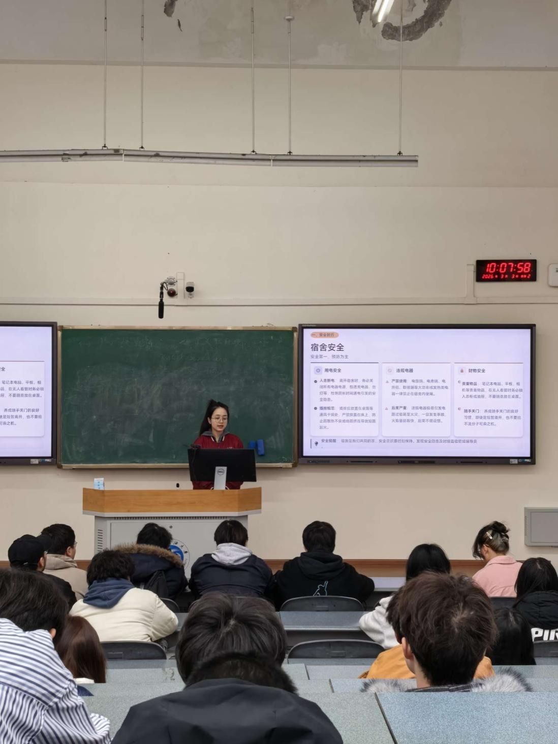 会上,蒲星宇老师重点开展安全教育,内容涵盖宿舍安全、防电信诈骗、人身及交通安全等方面。结合近期高校典型宿舍火灾案例,她重申 “人走断电” 要求,严禁违规使用大功率电器,强调插线板规范摆放等安全细节;针对 “刷单返利”“冒充熟人” 等高发诈骗类型,提醒同学们严守 “不轻信、不转账、不透露、多核实” 的防范原则;在人身与交通安全方面,叮嘱大家夜间尽量结伴出行、乘坐正规交通工具,并公布校园报警电话,强化安全意识。同时,她引导同学们尽快从假期状态调整至学习状态,以积极饱满的精神面貌迎接新学期。