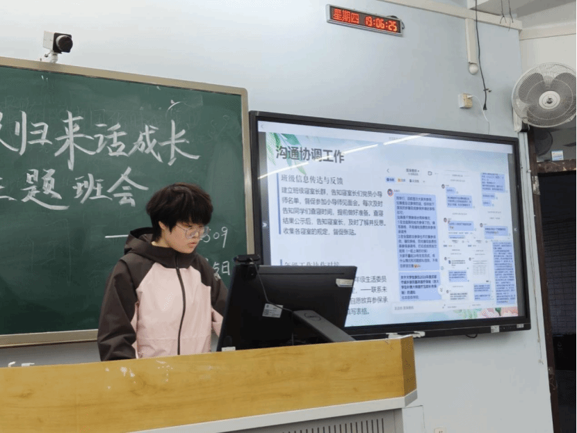生活委员介绍沟通协调工作机制,展示班级信息传达与反馈的完整流程