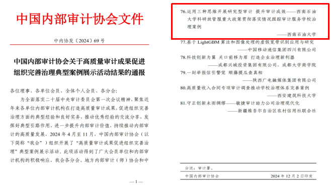 近日,中国内部审计协会公布了全国内部审计“高质量审计成果促进组织完善治理典型案例”评选结果,我校报送的《运用三种思维开展研究型审计提升审计成效——西南石油大学科研放管服重大政策贯彻落实情况跟踪审计服务学校治理案例》成功入选,是四川省唯一入选高校。这也是我校继2022年度获评全国“内部审计探索研究型审计典型实践案例”之后,再次荣获该项表彰。