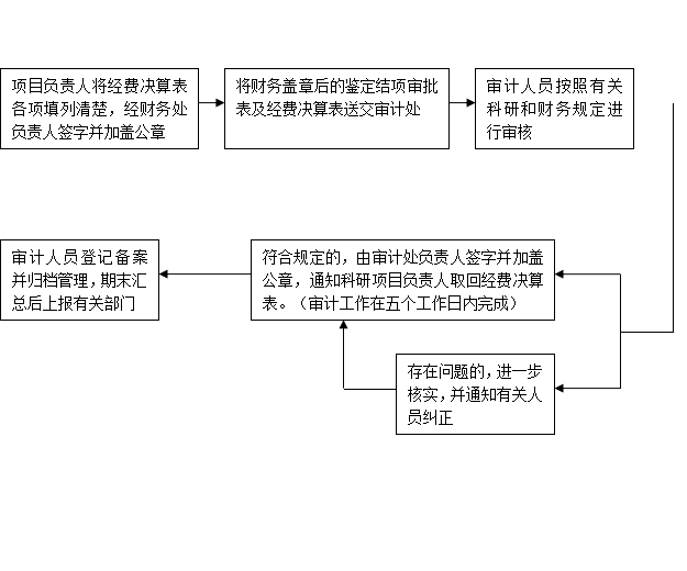 2、经审计,经费决算表数据与预算以及国家、学校相关规定相符的,由审计处在3个工作日内完成审签工作,签章后通知项目负责人取回审批表。