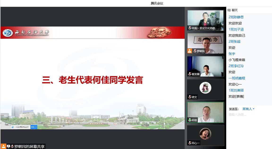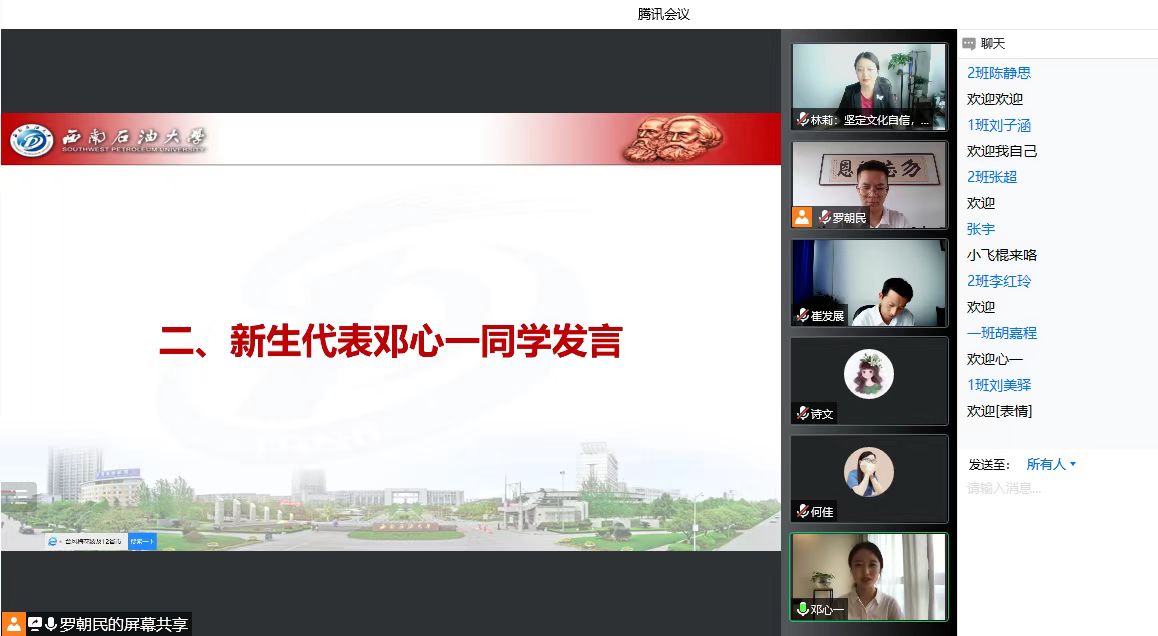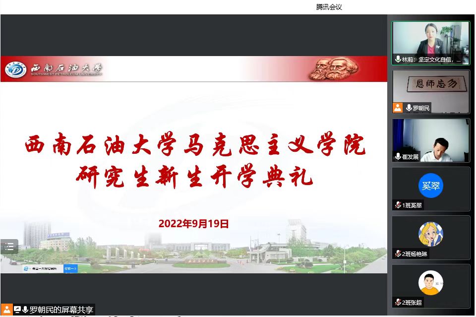 9月19日下午,西南石油大学马克思主义学院2022级研究生新生开学典礼在腾讯会议线上举行。学院党委书记、院长崔发展,党委副书记、纪委书记林莉,研究生教研室主任文婷婷,研究生辅导员罗朝民,老生代表以及2022级全体研究生参加开学典礼。开学典礼由罗朝民主持。