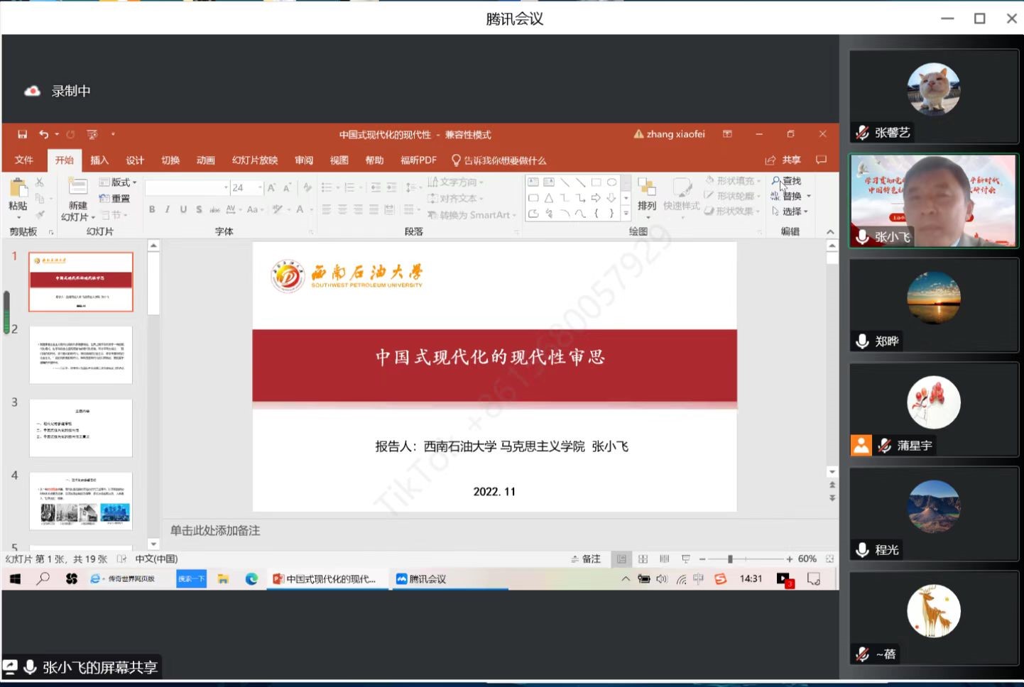 2022年11月26日,研究生教研室张小飞教授应邀参加了“学习贯彻党的二十大精神暨习近平新时代中国特色社会主义思想研讨会”,并在研讨会中作了题为“中国式现代化道路的现代性审思”的主题发言。该研讨会在腾讯会议上进行,研究生教研室其他教师也参与其中,全程收听了此次研讨会内容,并在会后作了进一步学习交流。
