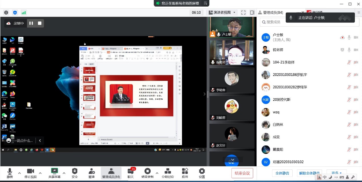 11月24日下午,党委常委、副校长祝效华为机电院2020级学生讲授了思政课,讲授内容为《习近平新时代中国特色社会主义思想概论》课第五讲以新发展理念引领高质量。因疫情防控,课程采用腾讯会议平台线上教学。