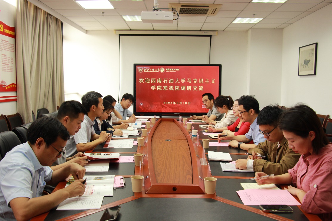 5月18日上午,我院党委书记、院长崔发展带队前往浙江工商大学马克思主义学院调研交流学科建设、研究生人才培养和思政课教学改革等工作,浙江工商大学马克思主义学院执行院长李梦云、副院长于希勇、办公室主任李佳、教学秘书李逸轩、马克思主义基本原理教研室副主任张岩冰等参加了交流座谈。