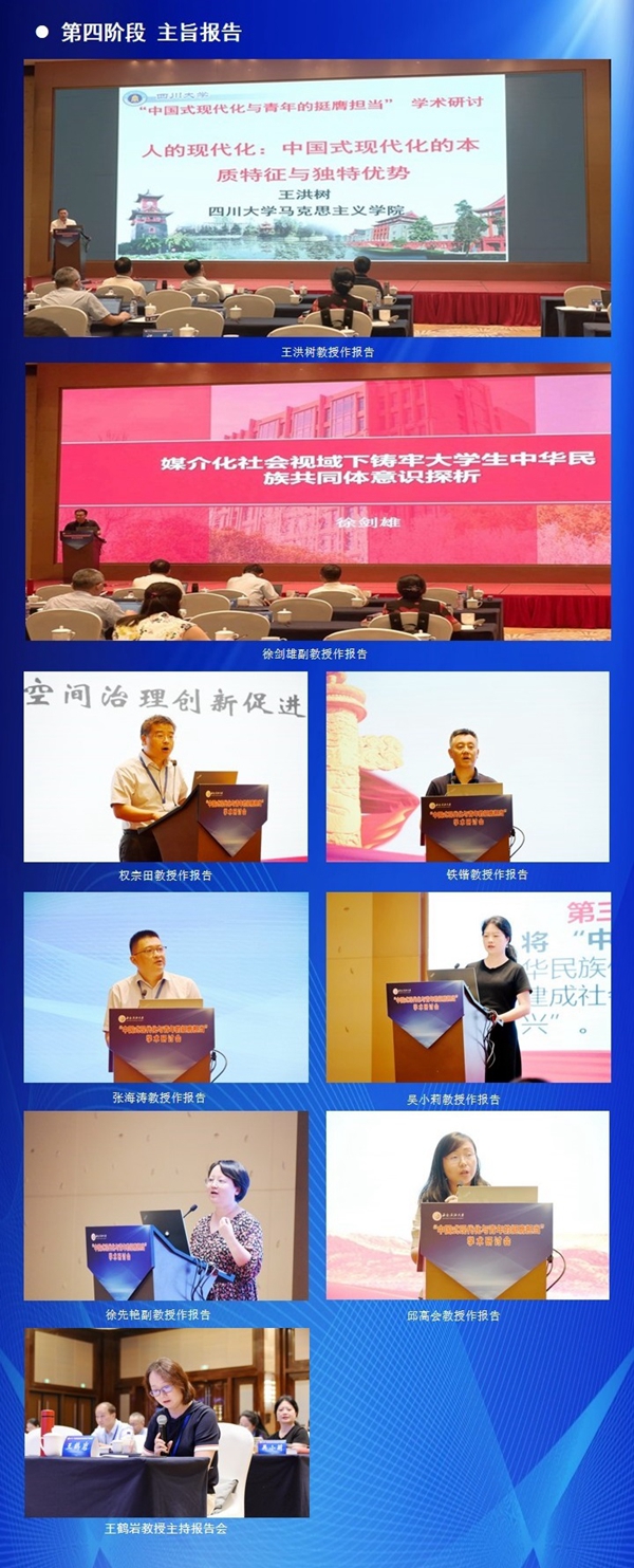 五个阶段的主旨报告分别由教育部全国高校思想政治理论课教学指导委员会委员、电子科技大学马院院长吴满意教授,教育部全国高校思想政治理论课教学指导委员会委员、西南石油大学马院原院长张小飞教授,四川大学马院党委书记李栓久教授,东北石油大学马院院长王鹤岩教授,绵阳师范学院马院院长冯莎教授主持。