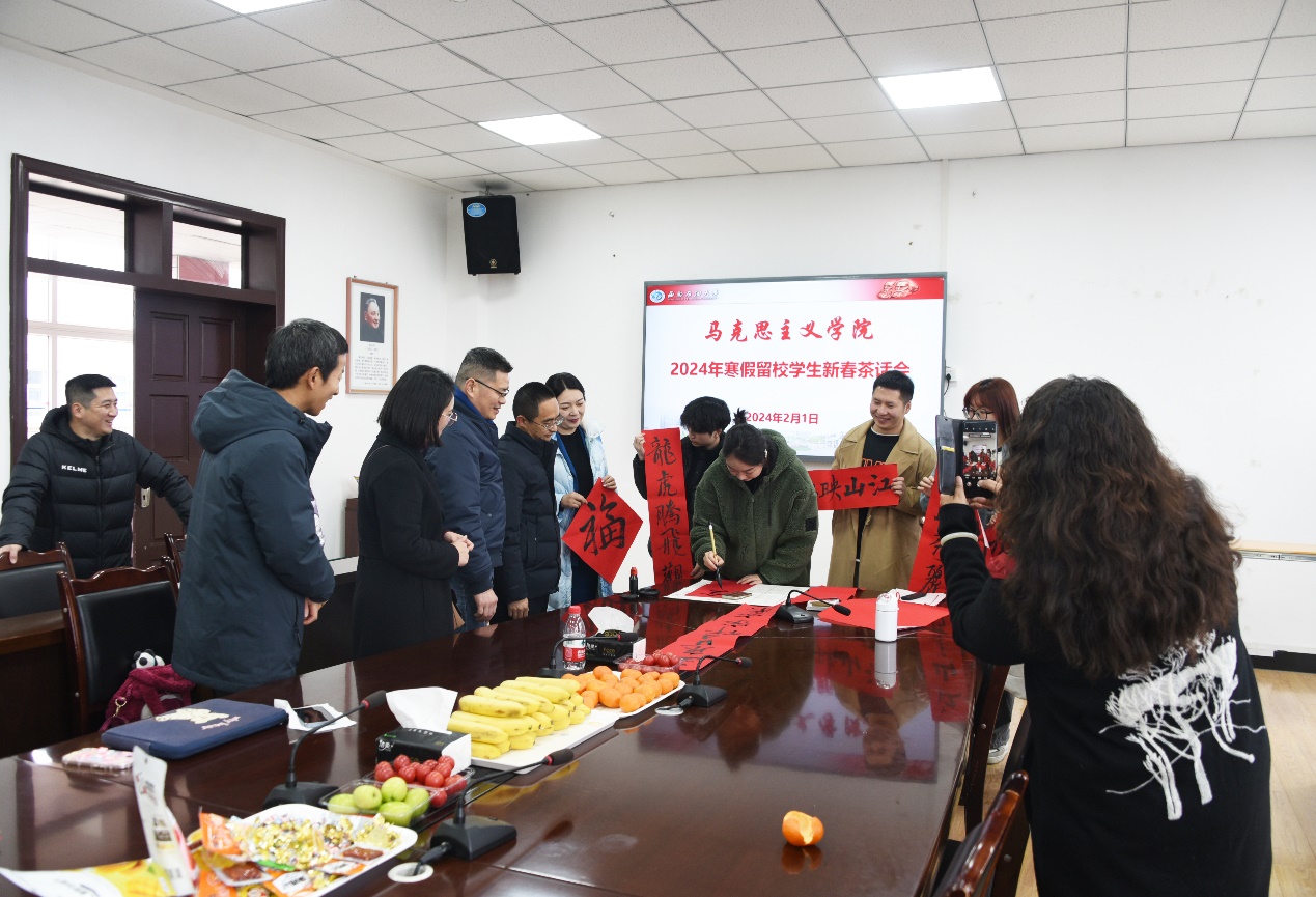衡彤一行首先来到思学楼D501学生工作办公室看望寒假值班人员,在学生工作办公室,学院党委书记孙德刚、院长崔发展、党委副书记林莉向衡书记汇报了马院留校学生基本情况、寒假学生工作安排、特殊群体学生关怀措施,并邀请衡彤一行参加思学楼D507举行的留校学生茶话会。茶话会上留校师生正在裁宣纸、写春联,衡彤表示写春联增添了节日的气氛,传承了春节的习俗,同时也加深了师生情感,是非常值得肯定的。她强调在学生工作开展中要做到有温度、有深度、有态度,这样学生工作才能做得好。同时衡书记还关切地询问了在场的毕业年级同学们的就业情况,对马院23届毕业生高质量就业作出了充分肯定,希望24届毕业生就业工作再上新台阶。