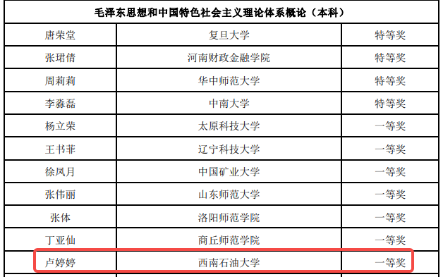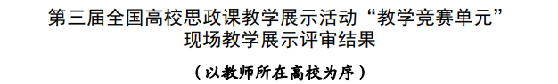 近日,教育部公示了第三届全国高校思想政治理论课教学展示活动“教学竞赛单元”评审结果。我院任重远老师荣获“马克思主义基本原理”组特等奖,卢婷婷老师荣获“毛泽东思想和中国特色社会主义理论体系概论”本科组一等奖,邵琪老师荣获“中国近现代史纲要”组一等奖,崔发展老师荣获“中国马克思主义与当代”组二等奖,获奖总数并列全国高校第1。