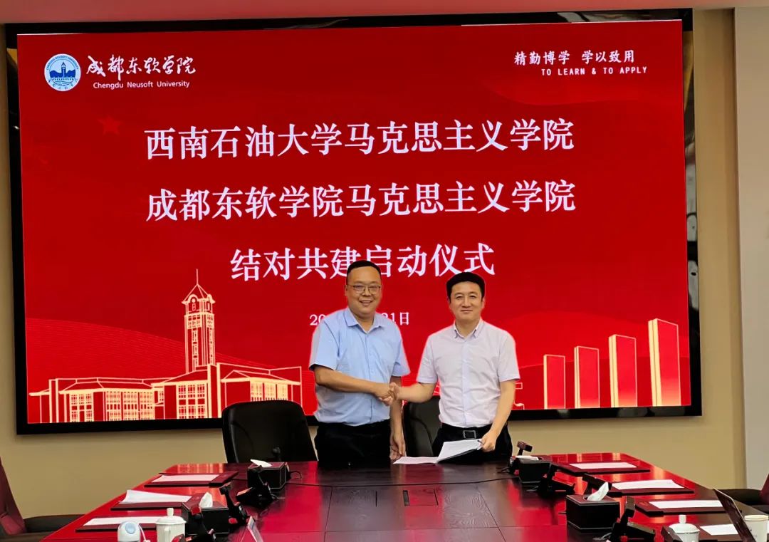 孙德刚、欧阳稚文分别代表两校马克思主义学院共同签署结对共建协议。会后,双方一同参观了成都东软学院图书馆。