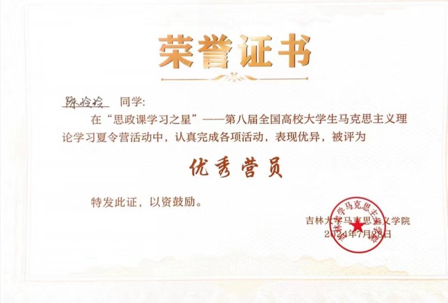 7月21日-7月28日,由教育部高校思政课教学指导委员会主办,吉林大学马克思主义学院承办的“思政课学习之星”——第八届全国大学生马克思主义理论学习夏令营在吉林省举行。经学校推荐、四川省教育厅遴选,我院思想政治教育专业2021级本科生陈玲玲代表我院第七届全国大学生讲思政课公开课展示活动特等奖团队参与了此次活动并获优秀营员。